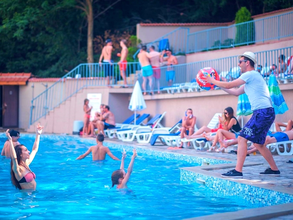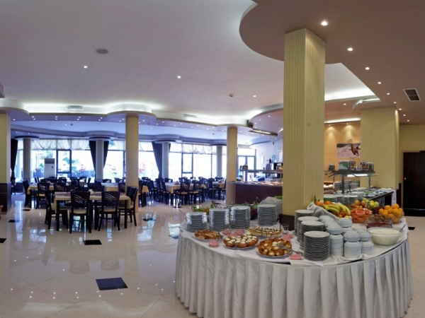 Hotellet huser en restaurant med en udendørs terrasse samt en pub, pizza bar, grillterrasse, massageklinik og en skønhedssalon, udendørs og indendørs swimmingpools og en børnepool med en rutsjebane.